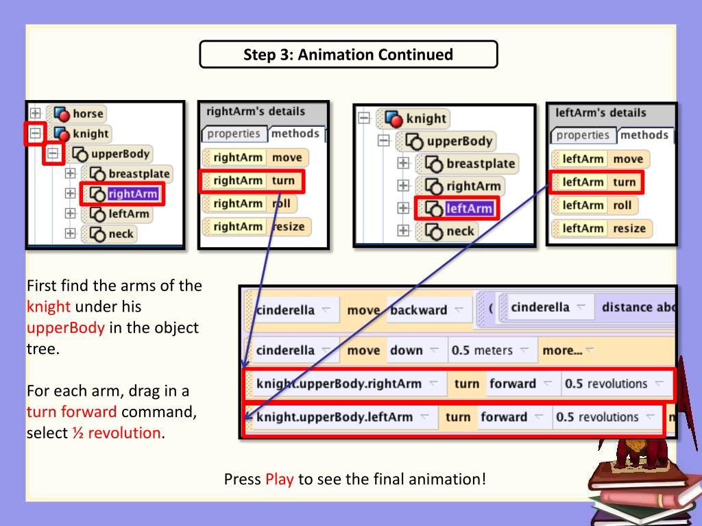 Step 3: Animation Continued First find the arms of the knight under his upperBody in the object tree. For each arm, drag in a turn forward command, select ½ revolution. Press Play to see the final animation!