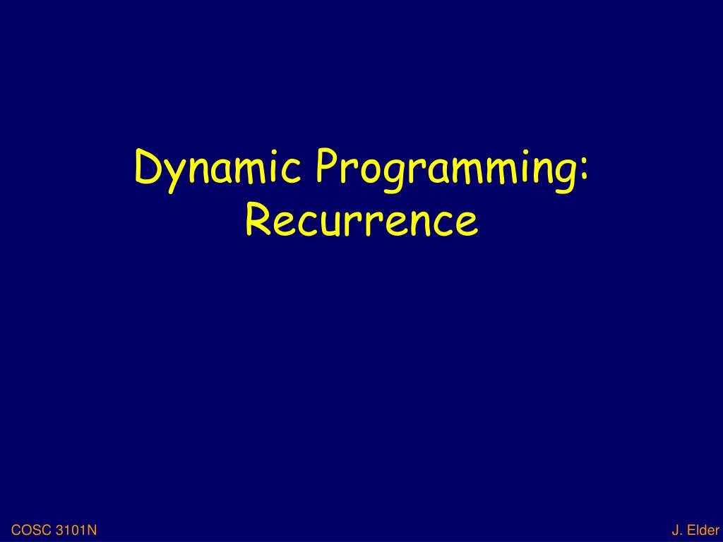 Dynamic programming • Step 1: Describe an array of values you want to compute. • Step 2: Give a recurrence for computing later values from earlier (bottom-up). • Step 3: Give a high-level program. • Step 4: Show how to use values in the array to compute an optimal solution.