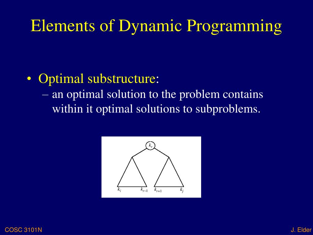 Elements of Dynamic Programming • Optimal substructure: • an optimal solution to the problem contains within it optimal solutions to subproblems.