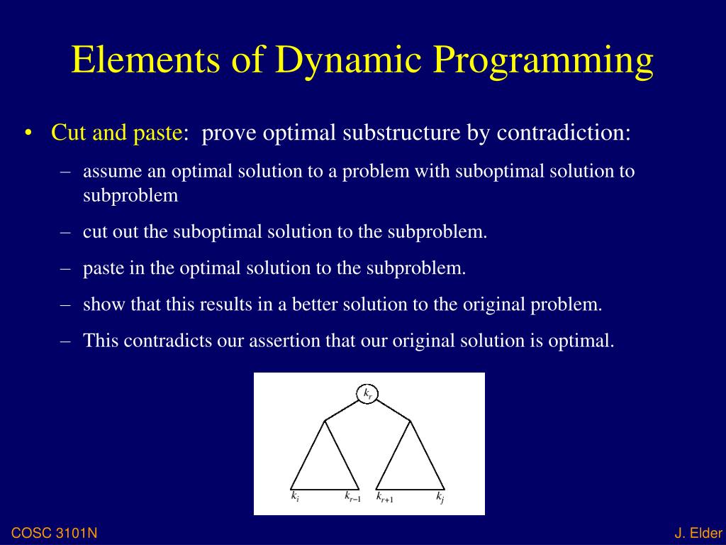 Elements of Dynamic Programming • Cut and paste: prove optimal substructure by contradiction: • assume an optimal solution to a problem with suboptimal solution to subproblem • cut out the suboptimal solution to the subproblem. • paste in the optimal solution to the subproblem. • show that this results in a better solution to the original problem. • This contradicts our assertion that our original solution is optimal.