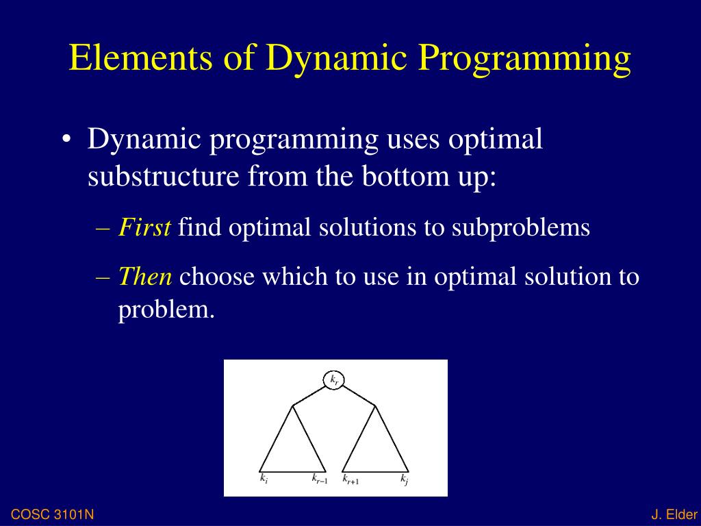 Elements of Dynamic Programming • Dynamic programming uses optimal substructure from the bottom up: • First find optimal solutions to subproblems • Then choose which to use in optimal solution to problem.