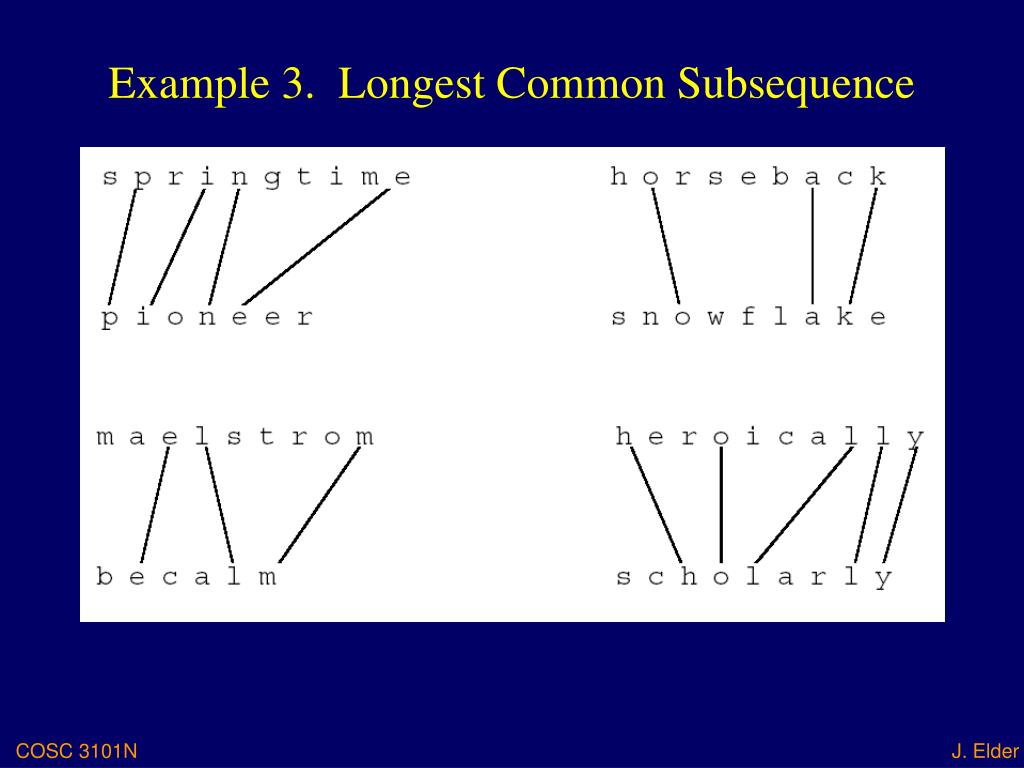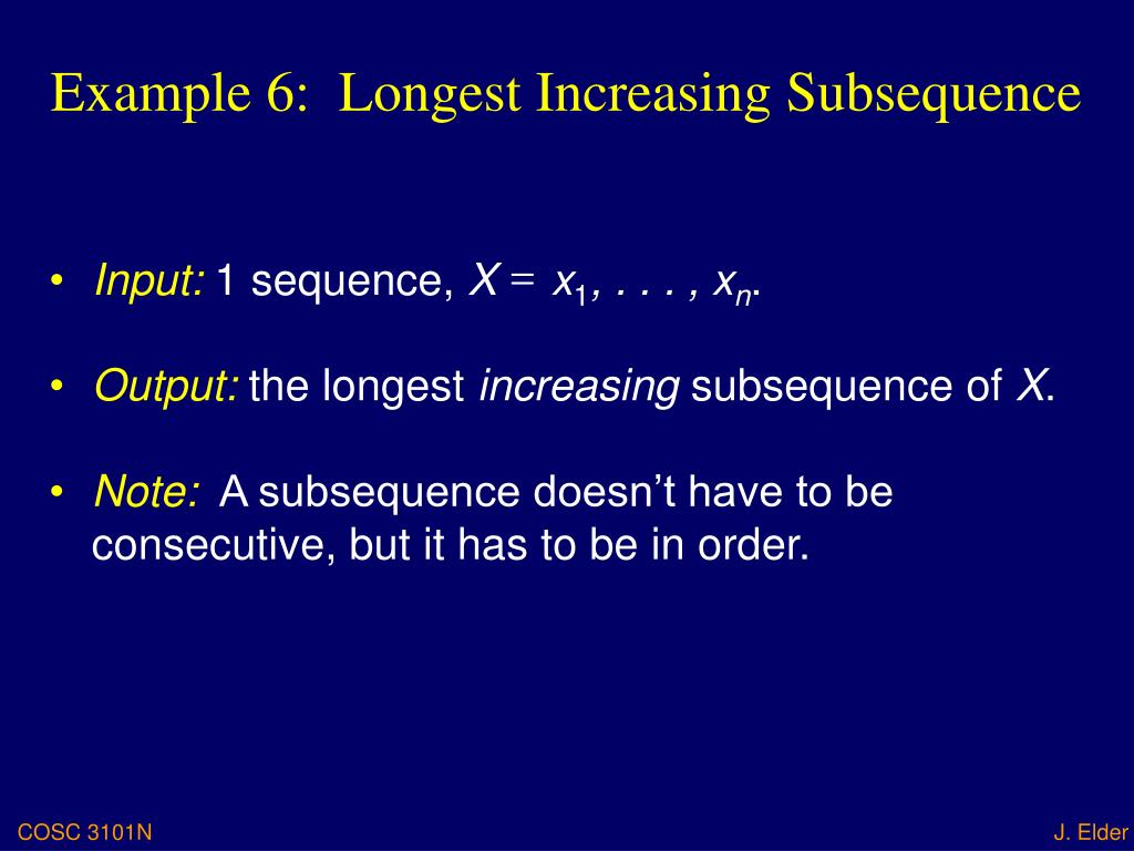 Example 6: Longest Increasing Subsequence • Input:1 sequence, X = x1, . . . , xn. • Output: the longest increasing subsequence of X. • Note: A subsequence doesn’t have to be consecutive, but it has to be in order.