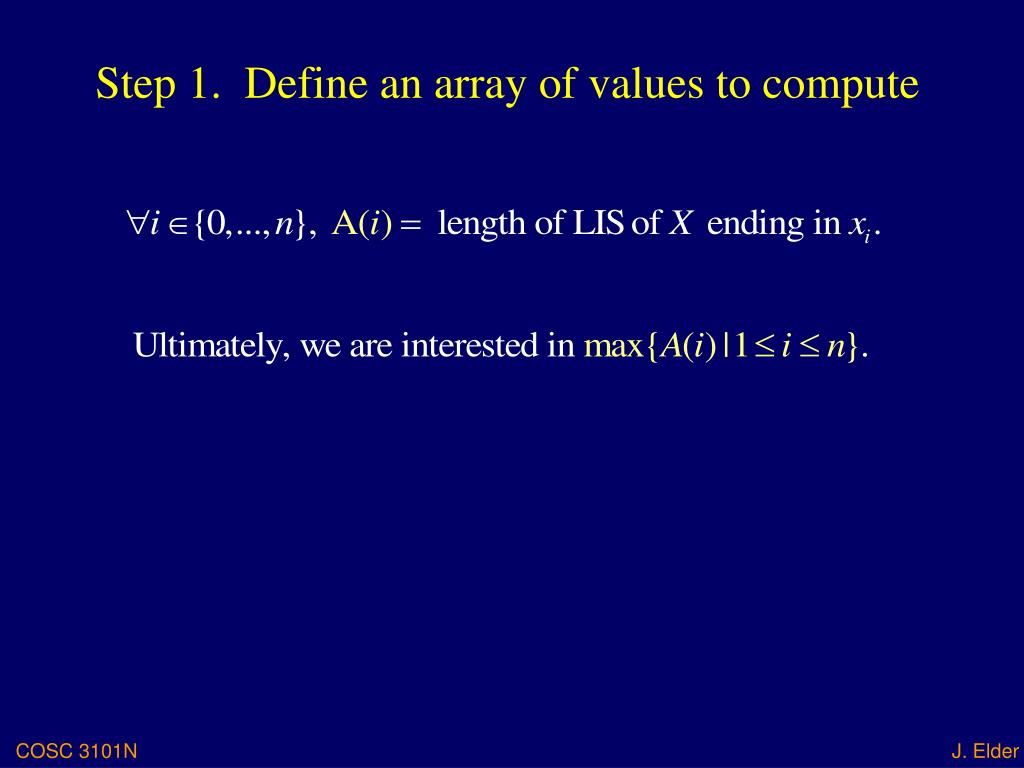Step 4. Compute Optimal Solution function lis=printLIS(X, A) [m,mi]=max(A); lis=printLISm(X,A,mi,'LIS: '); lis=[lis,sprintf('%d', X(mi))]; Running time? O(n) function lis=printLISm(X, A, mi, lis) if A(mi) > 1 i=mi-1; while ~(X(i) < X(mi) & A(i) == A(mi)-1) i=i-1; end lis=printLISm(X, A, i, lis); lis=[lis, sprintf('%d ', X(i))]; end