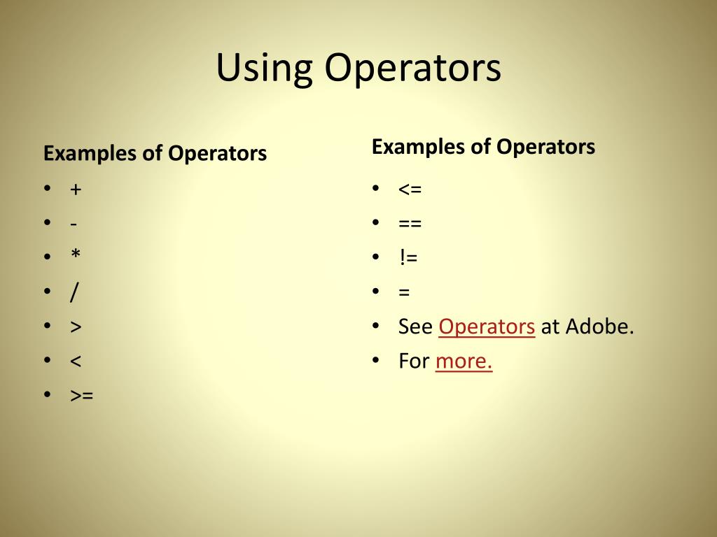 Using Operators Examples of Operators Examples of Operators <= == != = See Operators at Adobe. For more. • + • - • * • / • > • < • >=