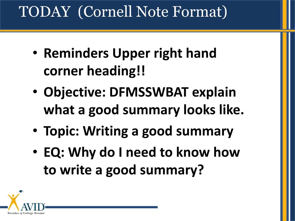 TODAY (Cornell Note Format) • Reminders Upper right hand corner heading!! • Objective: DFMSSWBAT explain what a good summary looks like. • Topic: Writing a good summary • EQ: Why do I need to know how to write a good summary?