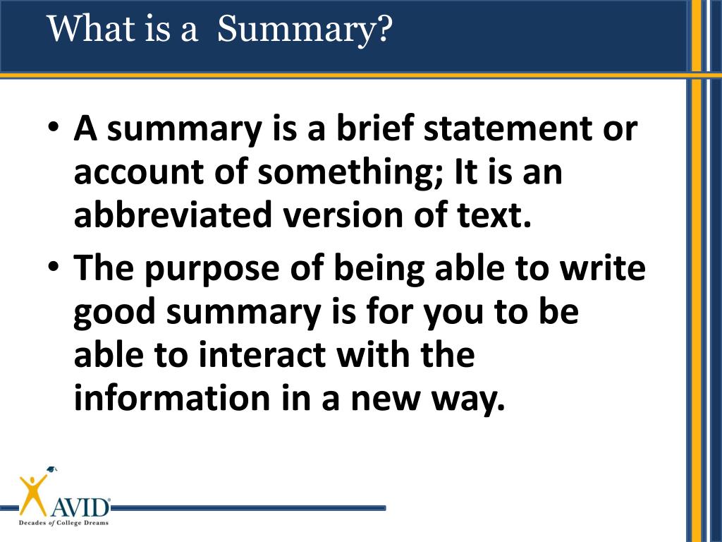 What is a Summary? • A summary is a brief statement or account of something; It is an abbreviated version of text. • The purpose of being able to write good summary is for you to be able to interact with the information in a new way.