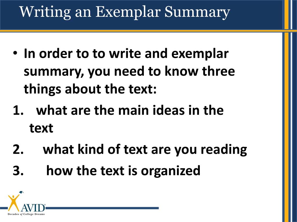Writing an Exemplar Summary • In order to to write and exemplar summary, you need to know three things about the text: • what are the main ideas in the text • what kind of text are you reading • how the text is organized