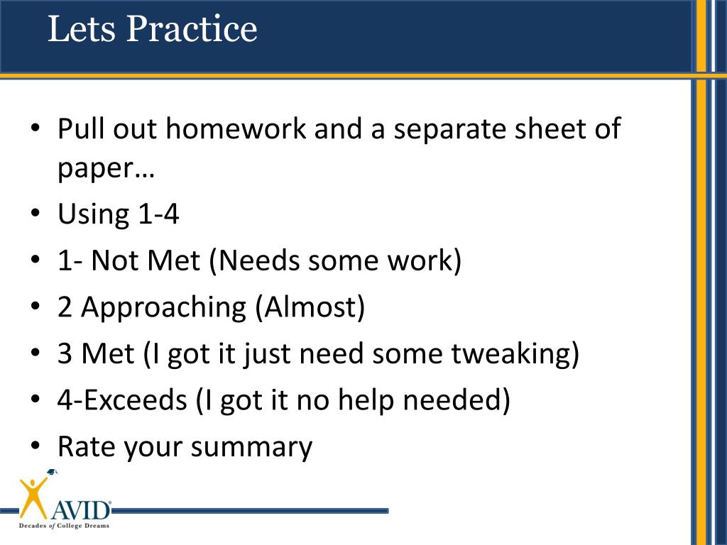 Lets Practice • Pull out homework and a separate sheet of paper… • Using 1-4 • 1- Not Met (Needs some work) • 2 Approaching (Almost) • 3 Met (I got it just need some tweaking) • 4-Exceeds (I got it no help needed) • Rate your summary