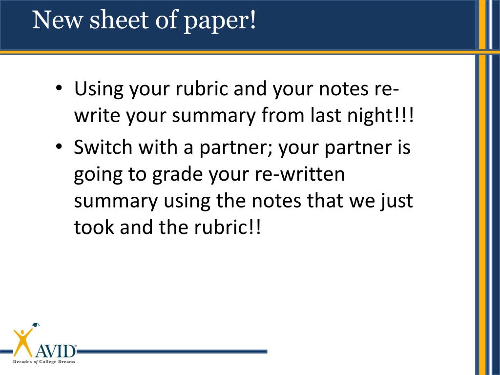New sheet of paper! • Using your rubric and your notes re-write your summary from last night!!! • Switch with a partner; your partner is going to grade your re-written summary using the notes that we just took and the rubric!!