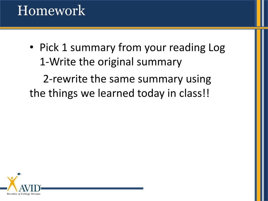 Homework • Pick 1 summary from your reading Log 1-Write the original summary 2-rewrite the same summary using the things we learned today in class!!