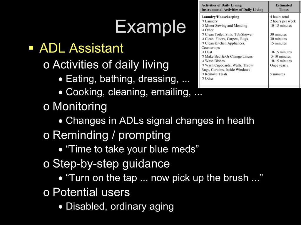 Example • ADL Assistant • Activities of daily living • Eating, bathing, dressing, ... • Cooking, cleaning, emailing, ... • Monitoring • Changes in ADLs signal changes in health • Reminding / prompting • “Time to take your blue meds” • Step-by-step guidance • “Turn on the tap ... now pick up the brush ...” • Potential users • Disabled, ordinary aging