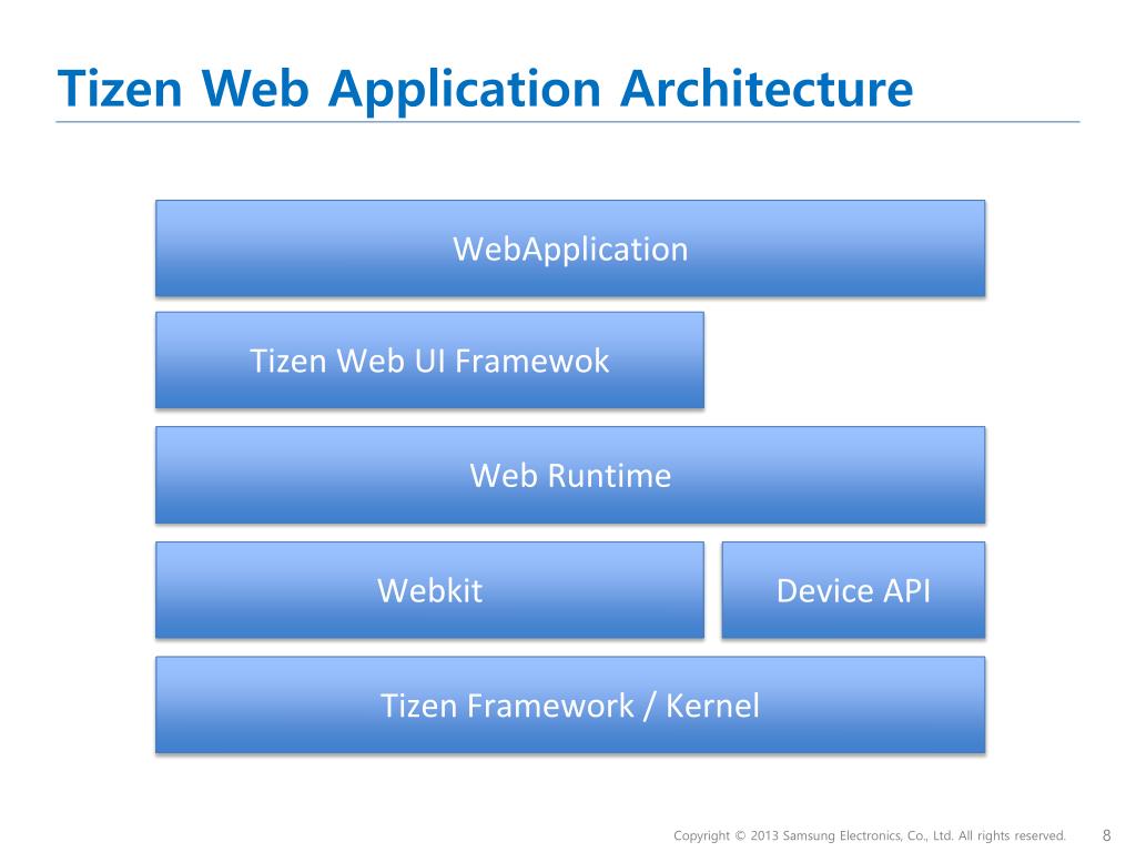 Tizen Web Application Architecture WebApplication Tizen Web UI Framewok Web Runtime Webkit Device API Tizen Framework / Kernel