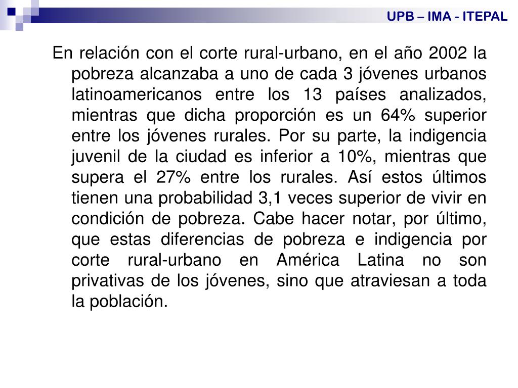 UPB – IMA - ITEPAL En relación con el corte rural-urbano, en el año 2002 la pobreza alcanzaba a uno de cada 3 jóvenes urbanos latinoamericanos entre los 13 países analizados, mientras que dicha proporción es un 64% superior entre los jóvenes rurales. Por su parte, la indigencia juvenil de la ciudad es inferior a 10%, mientras que supera el 27% entre los rurales. Así estos últimos tienen una probabilidad 3,1 veces superior de vivir en condición de pobreza. Cabe hacer notar, por último, que estas diferencias de pobreza e indigencia por corte rural-urbano en América Latina no son privativas de los jóvenes, sino que atraviesan a toda la población.