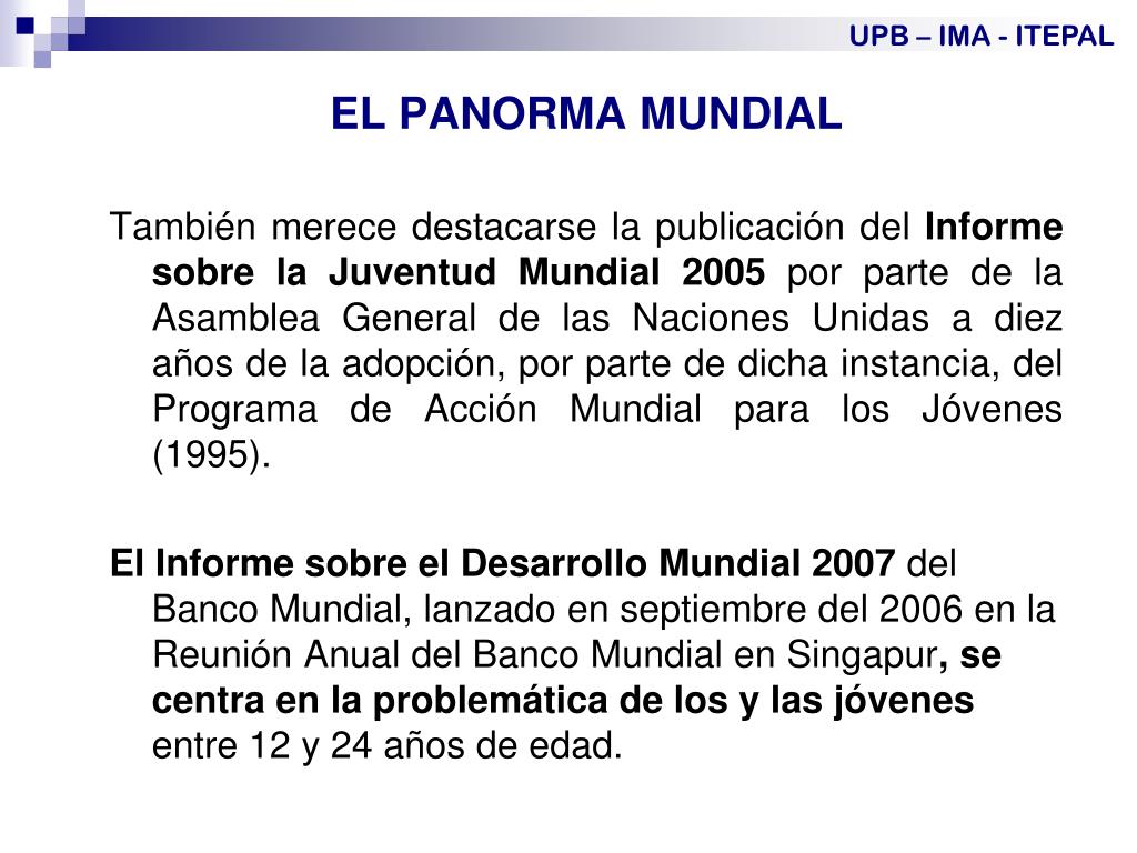 UPB – IMA - ITEPAL EL PANORMA MUNDIAL También merece destacarse la publicación del Informe sobre la Juventud Mundial 2005 por parte de la Asamblea General de las Naciones Unidas a diez años de la adopción, por parte de dicha instancia, del Programa de Acción Mundial para los Jóvenes (1995). El Informe sobre el Desarrollo Mundial 2007 del Banco Mundial, lanzado en septiembre del 2006 en la Reunión Anual del Banco Mundial en Singapur, se centra en la problemática de los y las jóvenes entre 12 y 24 años de edad.