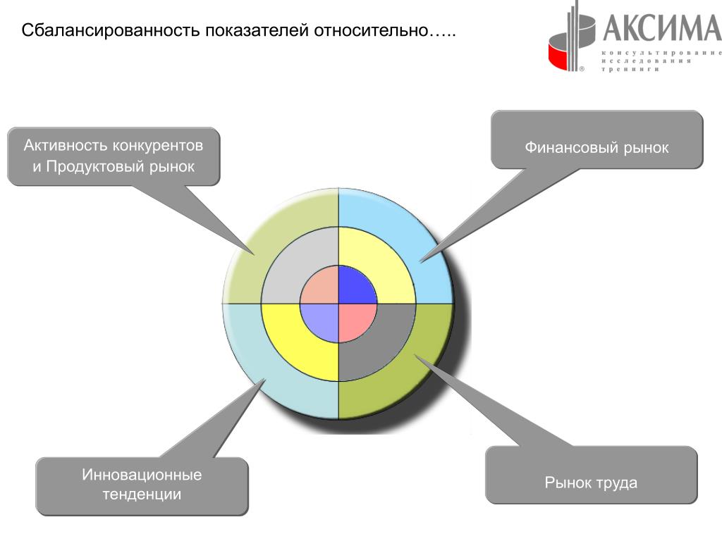 Сбалансированность показателей относительно….. Финансовый рынок Активность конкурентов и Продуктовый рынок Рынок труда Инновационные тенденции