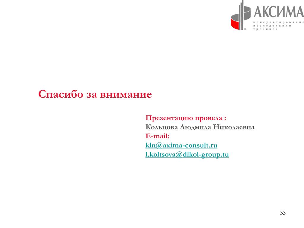 Спасибо за внимание Презентацию провела : Кольцова Людмила Николаевна E-mail: kln@axima-consult.ru l.koltsova@dikol-group.tu 33