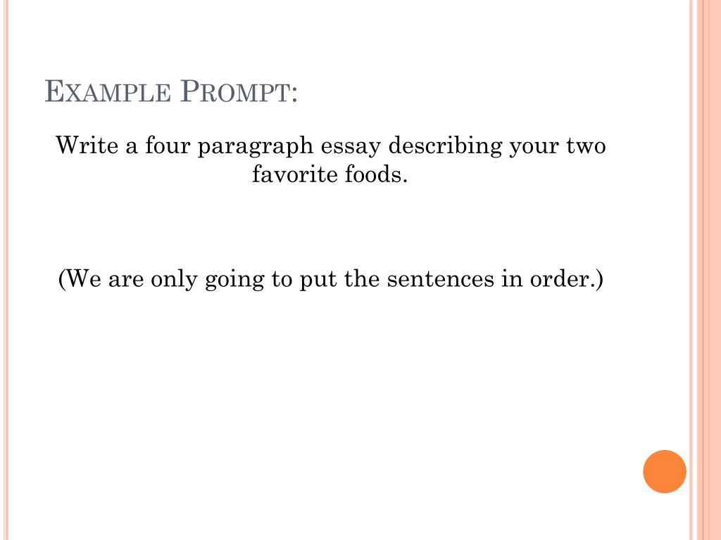 Example Prompt: Write a four paragraph essay describing your two favorite foods. (We are only going to put the sentences in order.)