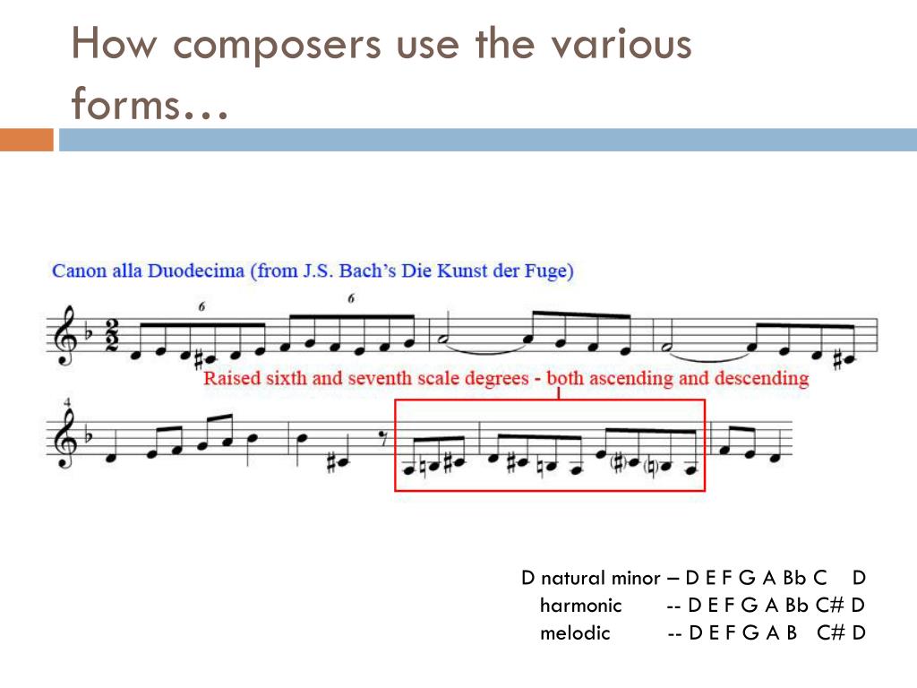 How composers use the various forms… D natural minor – D E F G A Bb C D harmonic -- D E F G A Bb C# D melodic -- D E F G A B C# D