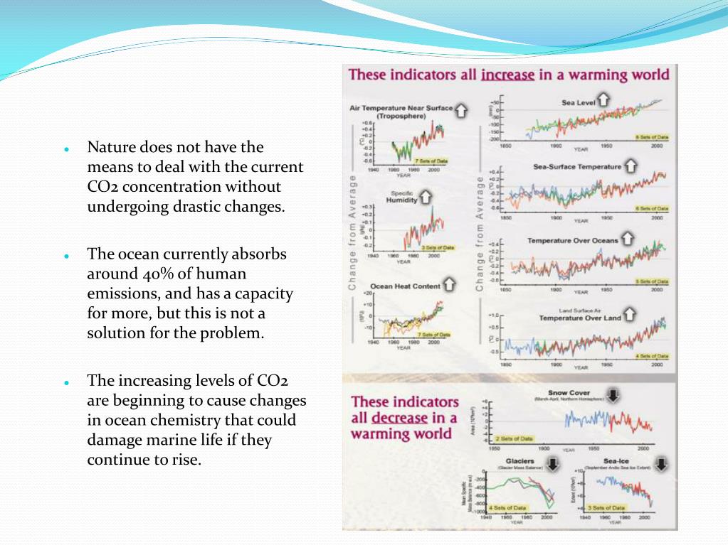Nature does not have the means to deal with the current CO2 concentration without undergoing drastic changes. The ocean currently absorbs around 40% of human emissions, and has a capacity for more, but this is not a solution for the problem. The increasing levels of CO2 are beginning to cause changes in ocean chemistry that could damage marine life if they continue to rise.
