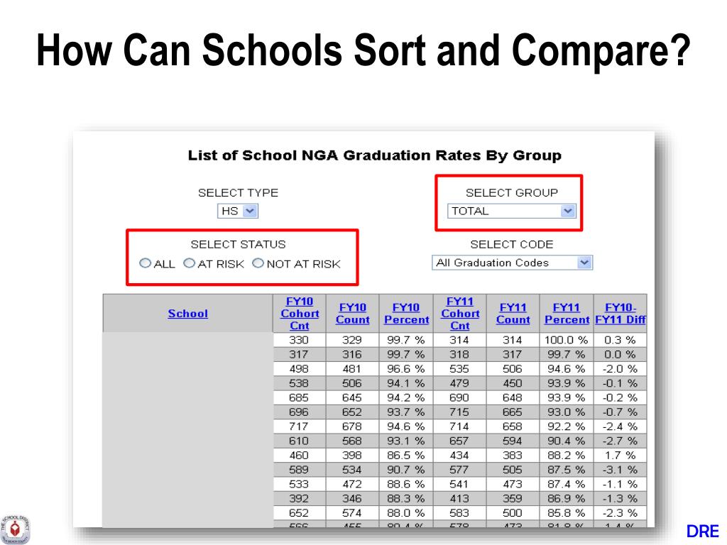 How Can Schools Sort and Compare? • School Profiles of NGA Grad Rate (Compare to self) • Wcodes (Graduation Codes) • Groups by • All or At-risk • Graduation Codes • School Listings of NGA Grad Rate (Compare to others) • Schools by • Group • All or At-risk • Graduation Codes • Compared to standard • Compared to self • Compared to others