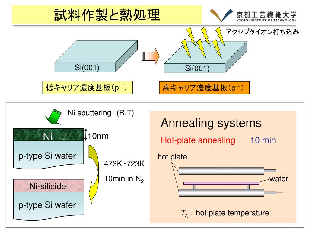 Ni sputtering(R.T) Ni 10nm p-type Si wafer Annealing systems Hot-plate annealing 10 min hot plate Ni-silicide wafer p-type Si wafer Ta = hot plate temperature 試料作製と熱処理 アクセプタイオン打ち込み Si(001) Si(001) 低キャリア濃度基板(p-) 高キャリア濃度基板(p+) 473K~723K 10min in N2