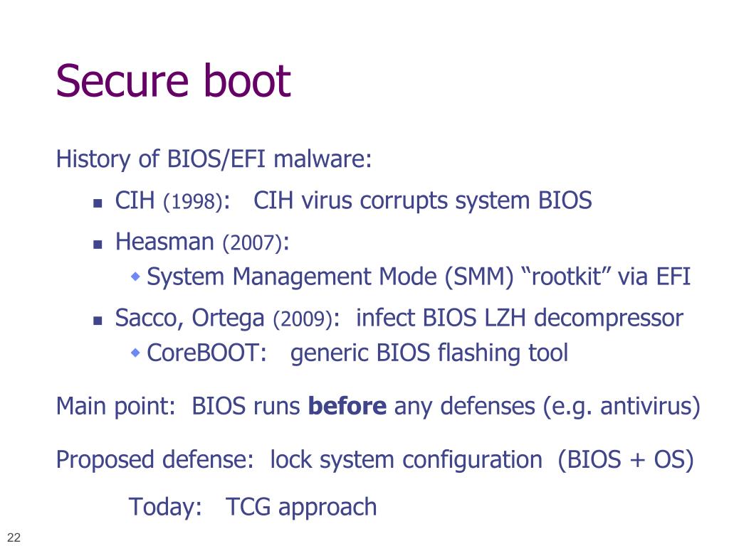 Secure boot History of BIOS/EFI malware: • CIH (1998): CIH virus corrupts system BIOS • Heasman(2007): • System Management Mode (SMM) “rootkit” via EFI • Sacco, Ortega (2009): infect BIOS LZH decompressor • CoreBOOT: generic BIOS flashing tool Main point: BIOS runs before any defenses (e.g. antivirus) Proposed defense: lock system configuration (BIOS + OS) Today: TCG approach