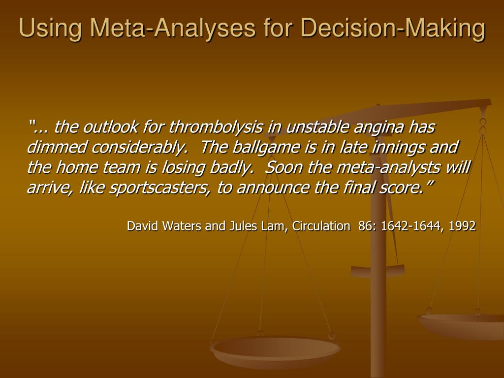 Using Meta-Analyses for Decision-Making “... the outlook for thrombolysis in unstable angina has dimmed considerably. The ballgame is in late innings and the home team is losing badly. Soon the meta-analysts will arrive, like sportscasters, to announce the final score.” David Waters and Jules Lam, Circulation 86: 1642-1644, 1992