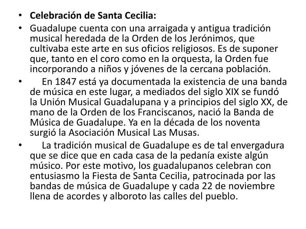Celebración de Santa Cecilia: • Guadalupe cuenta con una arraigada y antigua tradición musical heredada de la Orden de los Jerónimos, que cultivaba este arte en sus oficios religiosos. Es de suponer que, tanto en el coro como en la orquesta, la Orden fue incorporando a niños y jóvenes de la cercana población. • En 1847 está ya documentada la existencia de una banda de música en este lugar, a mediados del siglo XIX se fundó la Unión Musical Guadalupana y a principios del siglo XX, de mano de la Orden de los Franciscanos, nació la Banda de Música de Guadalupe. Ya en la década de los noventa surgió la Asociación Musical Las Musas. • La tradición musical de Guadalupe es de tal envergadura que se dice que en cada casa de la pedanía existe algún músico. Por este motivo, los guadalupanos celebran con entusiasmo la Fiesta de Santa Cecilia, patrocinada por las bandas de música de Guadalupe y cada 22 de noviembre llena de acordes y alboroto las calles del pueblo.