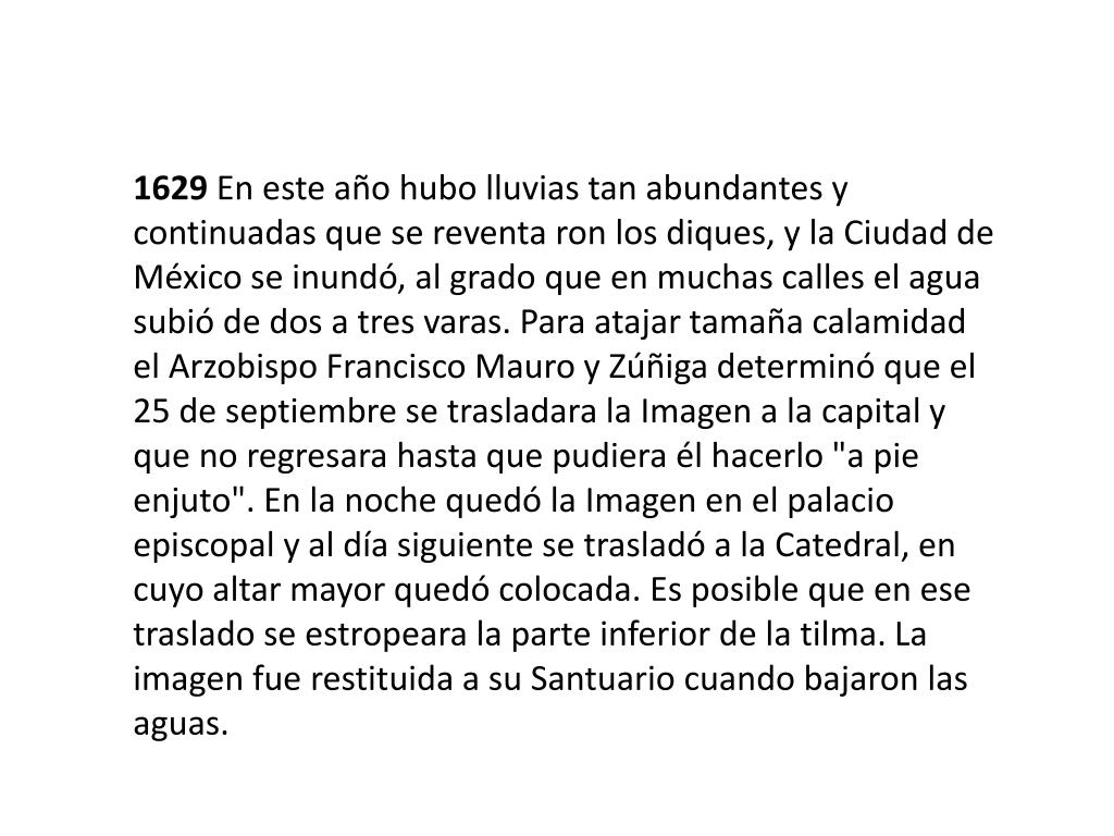 1629 En este año hubo lluvias tan abundantes y continuadas que se reventa ron los diques, y la Ciudad de México se inundó, al grado que en muchas calles el agua subió de dos a tres varas. Para atajar tamaña calamidad el Arzobispo Francisco Mauro y Zúñiga determinó que el 25 de septiembre se trasladara la Imagen a la capital y que no regresara hasta que pudiera él hacerlo "a pie enjuto". En la noche quedó la Imagen en el palacio episcopal y al día siguiente se trasladó a la Catedral, en cuyo altar mayor quedó colocada. Es posible que en ese traslado se estropeara la parte inferior de la tilma. La imagen fue restituida a su Santuario cuando bajaron las aguas.