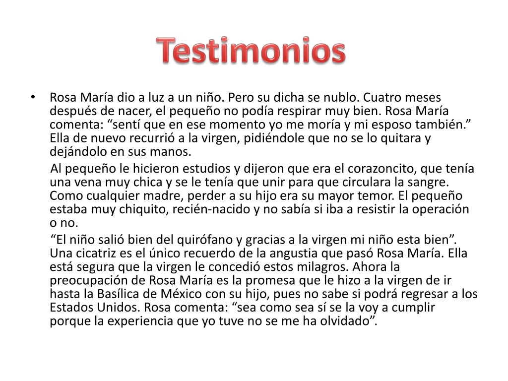 Testimonios • Rosa María dio a luz a un niño. Pero su dicha se nublo. Cuatro meses después de nacer, el pequeño no podía respirar muy bien. Rosa María comenta: “sentí que en ese momento yo me moría y mi esposo también.” Ella de nuevo recurrió a la virgen, pidiéndole que no se lo quitara y dejándolo en sus manos. Al pequeño le hicieron estudios y dijeron que era el corazoncito, que tenía una vena muy chica y se le tenía que unir para que circulara la sangre. Como cualquier madre, perder a su hijo era su mayor temor. El pequeño estaba muy chiquito, recién-nacido y no sabía si iba a resistir la operación o no. “El niño salió bien del quirófano y gracias a la virgen mi niño esta bien”. Una cicatriz es el único recuerdo de la angustia que pasó Rosa María. Ella está segura que la virgen le concedió estos milagros. Ahora la preocupación de Rosa María es la promesa que le hizo a la virgen de ir hasta la Basílica de México con su hijo, pues no sabe si podrá regresar a los Estados Unidos. Rosa comenta: “sea como sea sí se la voy a cumplir porque la experiencia que yo tuve no se me ha olvidado”.