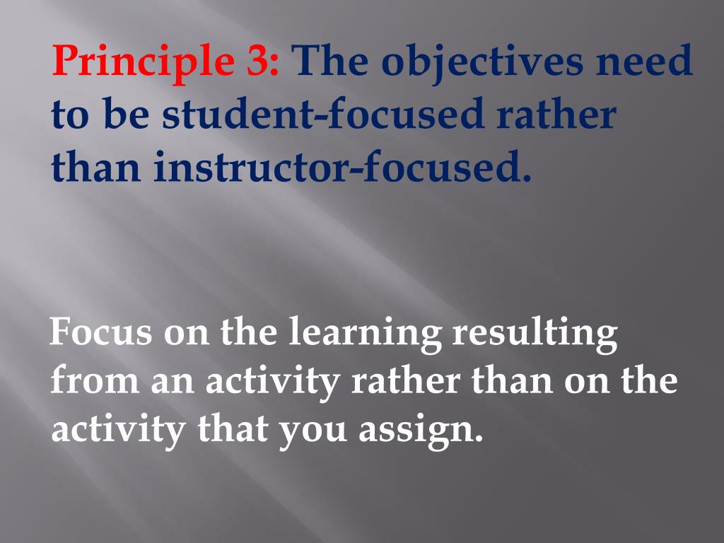 Principle 3: The objectives need to be student-focused rather than instructor-focused. Focus on the learning resulting from an activity rather than on the activity that you assign.