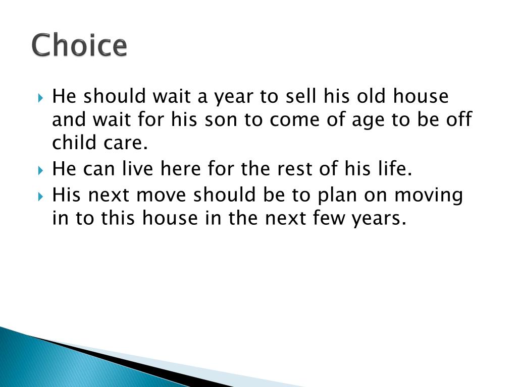 Choice • He should wait a year to sell his old house and wait for his son to come of age to be off child care. • He can live here for the rest of his life. • His next move should be to plan on moving in to this house in the next few years.