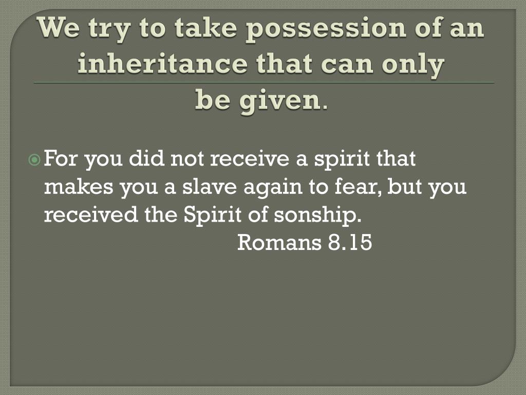 We try to take possession of an inheritance that can only be given. For you did not receive a spirit that makes you a slave again to fear, but you received the Spirit of sonship. Romans 8.15