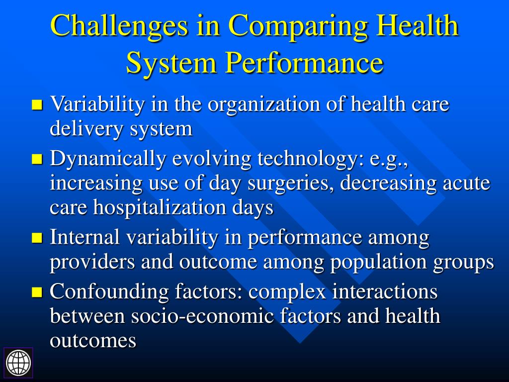 Challenges in Comparing Health System Performance • Variability in the organization of health care delivery system • Dynamically evolving technology: e.g., increasing use of day surgeries, decreasing acute care hospitalization days • Internal variability in performance among providers and outcome among population groups • Confounding factors: complex interactions between socio-economic factors and health outcomes