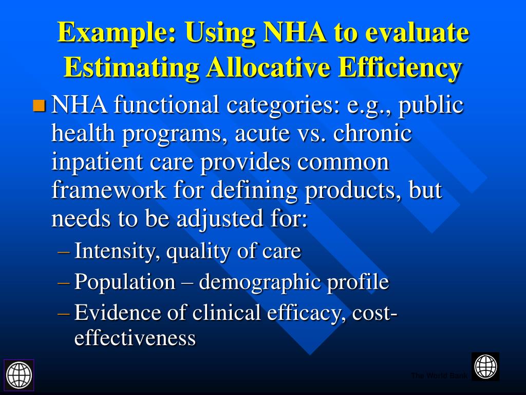 Example: Using NHA to evaluate Estimating Allocative Efficiency • NHA functional categories: e.g., public health programs, acute vs. chronic inpatient care provides common framework for defining products, but needs to be adjusted for: • Intensity, quality of care • Population – demographic profile • Evidence of clinical efficacy, cost-effectiveness