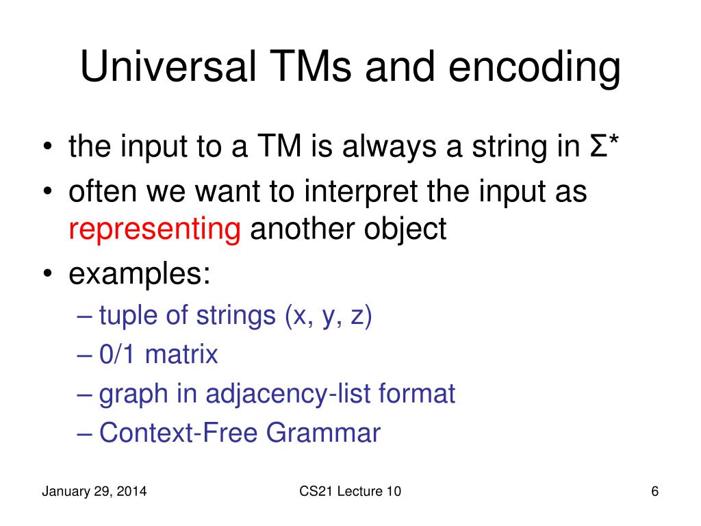 Universal TMs and encoding • the input to a TM is always a string in Σ* • often we want to interpret the input as representing another object • examples: • tuple of strings (x, y, z) • 0/1 matrix • graph in adjacency-list format • Context-Free Grammar CS21 Lecture 10