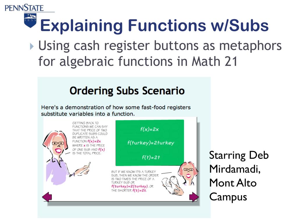 Explaining Functions w/Subs • Using cash register buttons as metaphors for algebraic functions in Math 21 Starring Deb Mirdamadi, Mont Alto Campus