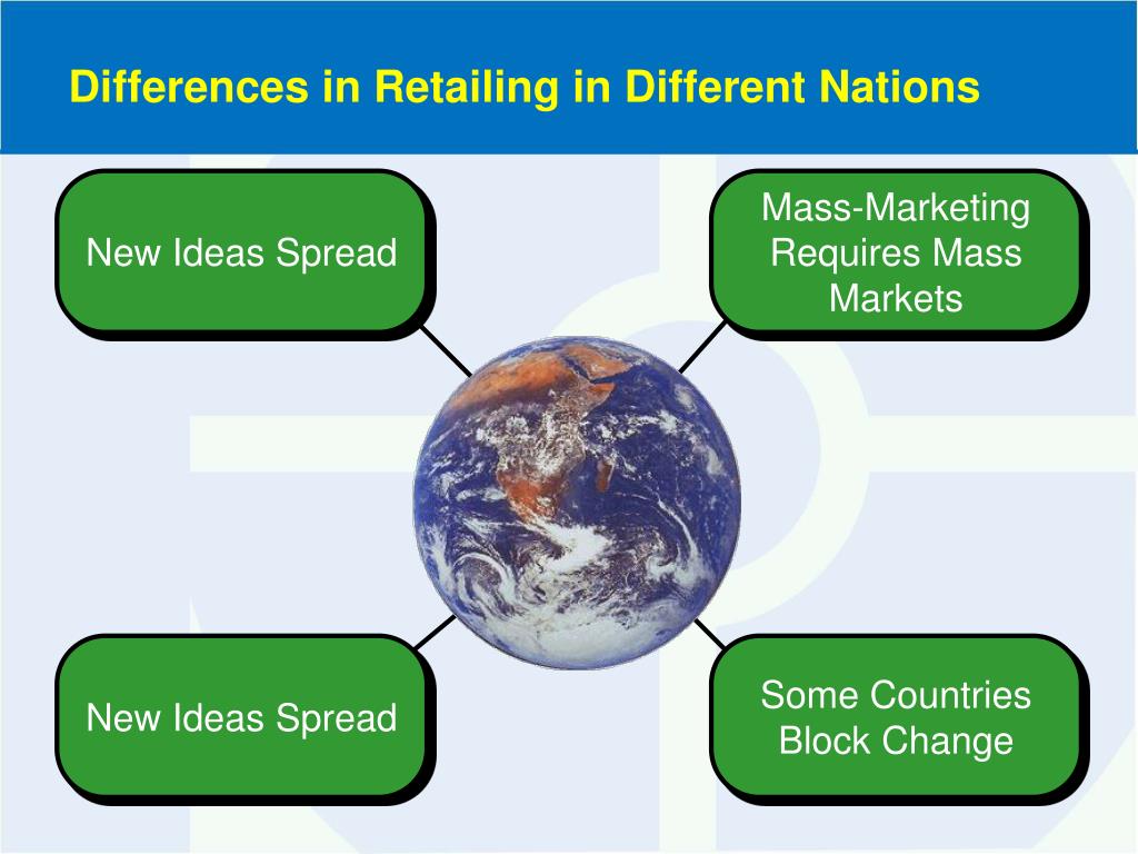 Differences in Retailing in Different Nations New Ideas Spread Mass-Marketing Requires Mass Markets New Ideas Spread Some Countries Block Change