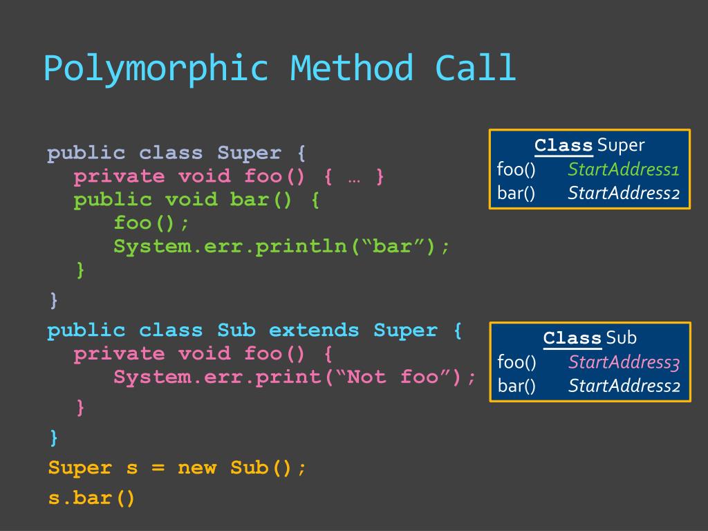 Normal Method Call Class Super foo() StartAddress1bar() StartAddress2 public class Super {private void foo() {System.err.print(“Foo”); }public void bar() {foo();System.err.println(“bar”);} } Super s = new Super(); s.bar();