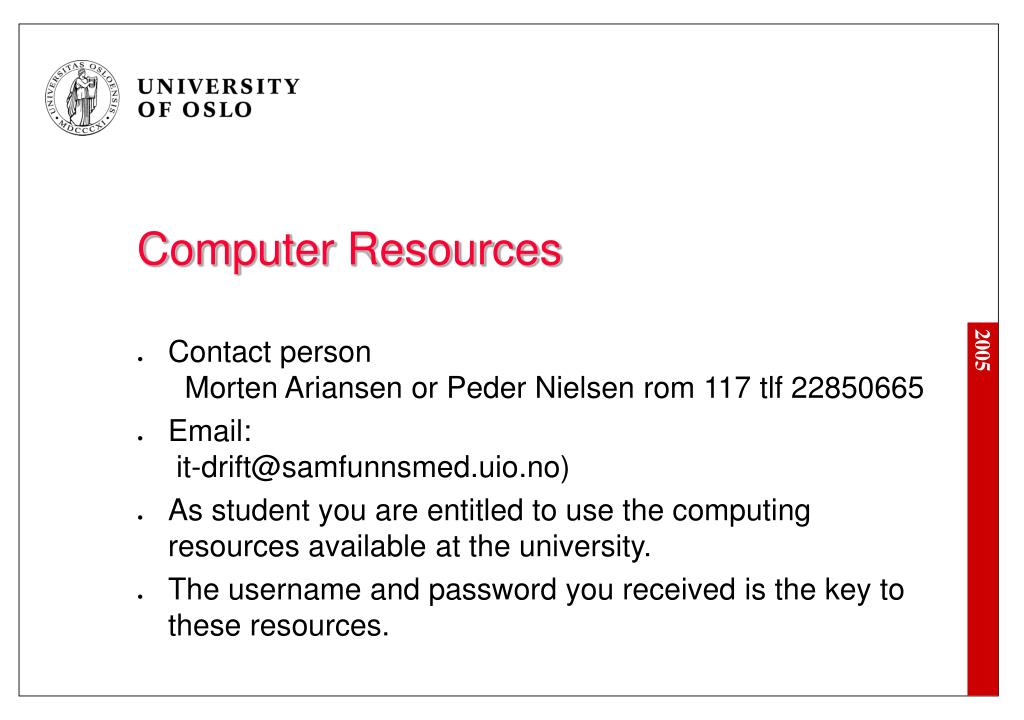 Computer Resources • Contact person Morten Ariansen or Peder Nielsen rom 117 tlf 22850665 • Email: it-drift@samfunnsmed.uio.no) • As student you are entitled to use the computing resources available at the university. • The username and password you received is the key to these resources.