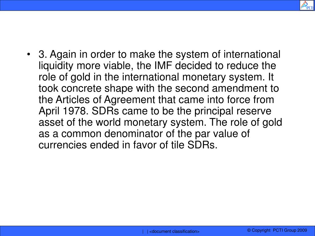 3. Again in order to make the system of international liquidity more viable, the IMF decided to reduce the role of gold in the international monetary system. It took concrete shape with the second amendment to the Articles of Agreement that came into force from April 1978. SDRs came to be the principal reserve asset of the world monetary system. The role of gold as a common denominator of the par value of currencies ended in favor of tile SDRs. | | <document classification>