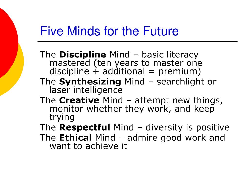 Five Minds for the Future The Discipline Mind – basic literacy mastered (ten years to master one discipline + additional = premium) The Synthesizing Mind – searchlight or laser intelligence The Creative Mind – attempt new things, monitor whether they work, and keep trying The Respectful Mind – diversity is positive The Ethical Mind – admire good work and want to achieve it
