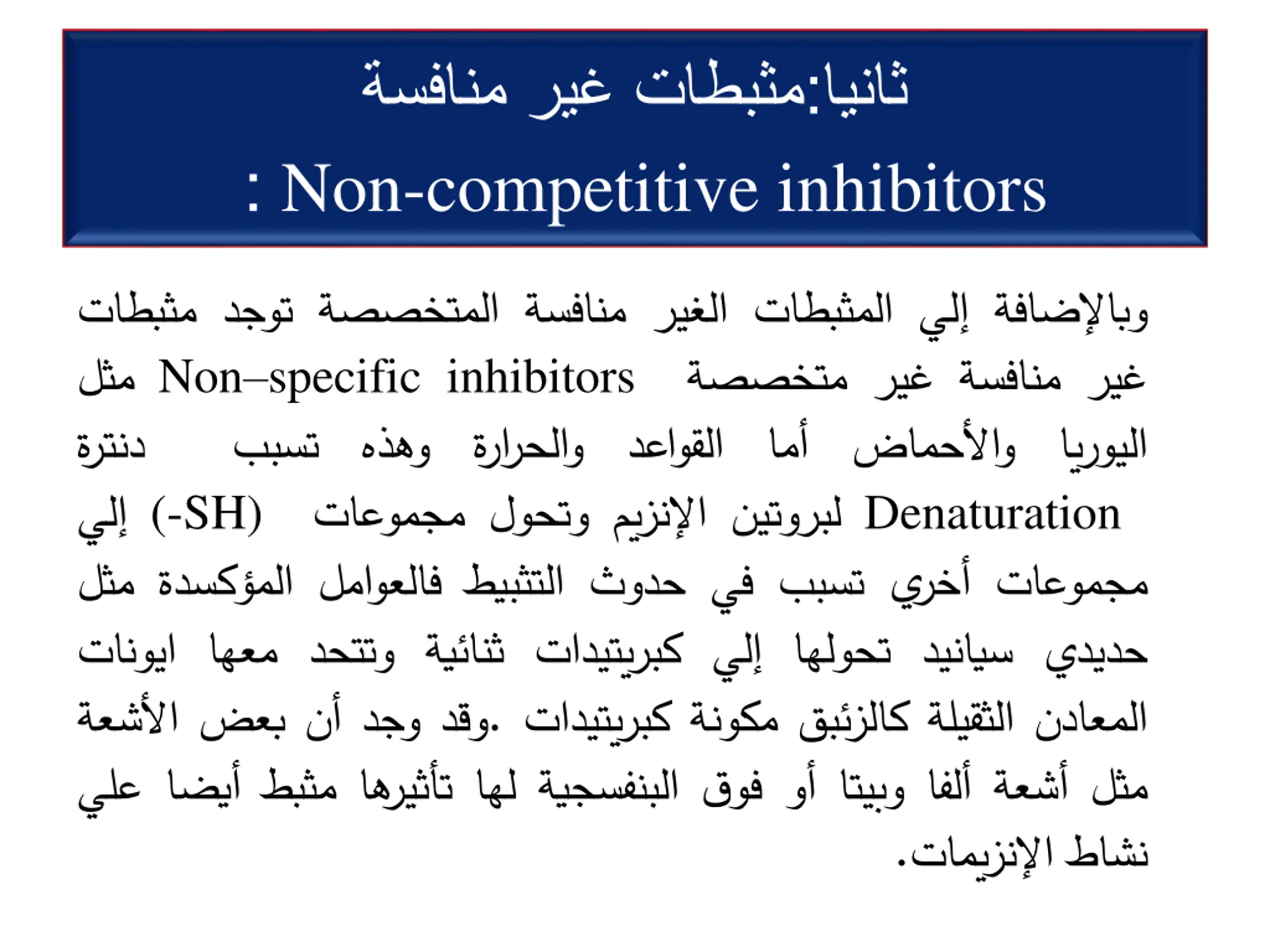 ةسفانم ريغ تاطبثم : ايناث : Non-competitive inhibitors طبث ثم تن يخإ ثم نويا عشلأا ي ع م جوت صتمخا سف نم يغخا طبثمخا صتم مأ يتو بخ ببست يخإ نو م وأ يخإ ف ضلإ بو سف نم يغ ض محلأاو Denaturation ل ي صأ ين يس ي ثخا فخأ ميزنلإا يغ ي ويخا Non–specific inhibitors هو عومجم (-SH) ماوعخ ف حتتو جو ه يثأت ببست ا حخاو لوحتو طيبثتخا يئ نث . هخ عاو خا ميزنلإا ثو ح ا يتي ب ا يتي ب يجسفنبخا س ؤمخا هعم ضعب ضيأ يف عومجم ي ي ح عمخا عشأ ط شن هخوحت قبئزخ تيبو أ بثم قو ل قوف ط ثم .