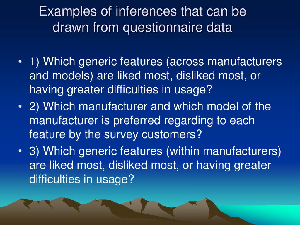 Examples of inferences that can be drawn from questionnaire data • 1) Which generic features (across manufacturers and models) are liked most, disliked most, or having greater difficulties in usage? • 2) Which manufacturer and which model of the manufacturer is preferred regarding to each feature by the survey customers? • 3) Which generic features (within manufacturers) are liked most, disliked most, or having greater difficulties in usage?