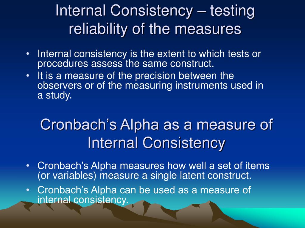 Internal Consistency – testing reliability of the measures • Internal consistency is the extent to which tests or procedures assess the same construct. • It is a measure of the precision between the observers or of the measuring instruments used in a study. • Cronbach’s Alpha measures how well a set of items (or variables) measure a single latent construct. • Cronbach’s Alpha can be used as a measure of internal consistency. Cronbach’s Alpha as a measure of Internal Consistency