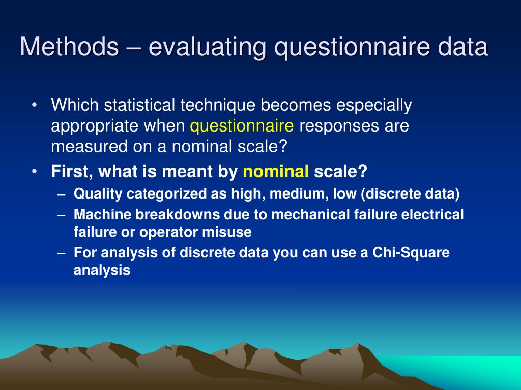 Methods – evaluating questionnaire data • Which statistical technique becomes especially appropriate when questionnaire responses are measured on a nominal scale? • First, what is meant by nominal scale? • Quality categorized as high, medium, low (discrete data) • Machine breakdowns due to mechanical failure electrical failure or operator misuse • For analysis of discrete data you can use a Chi-Square analysis