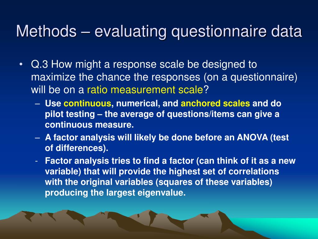 Methods – evaluating questionnaire data • Q.3 How might a response scale be designed to maximize the chance the responses (on a questionnaire) will be on a ratio measurement scale? • Use continuous, numerical, and anchoredscales and do pilot testing – the average of questions/items can give a continuous measure. • A factor analysis will likely be done before an ANOVA (test of differences). • Factor analysis tries to find a factor (can think of it as a new variable) that will provide the highest set of correlations with the original variables (squares of these variables) producing the largest eigenvalue.