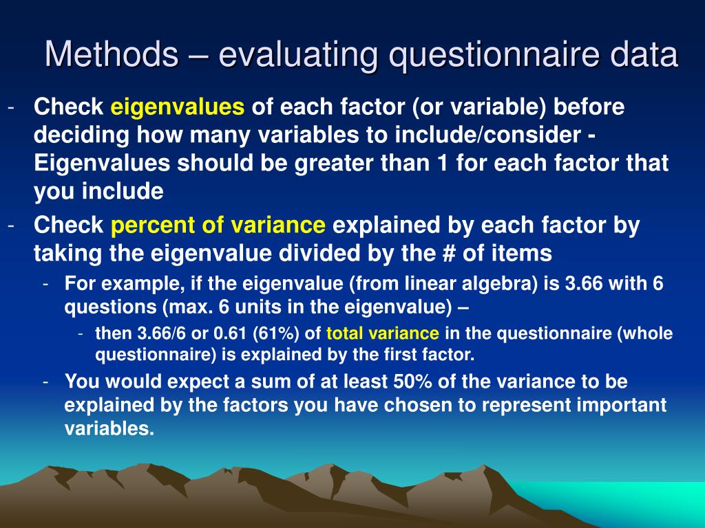 Methods – evaluating questionnaire data • Check eigenvalues of each factor (or variable) before deciding how many variables to include/consider - Eigenvalues should be greater than 1 for each factor that you include • Check percent of variance explained by each factor by taking the eigenvalue divided by the # of items • For example, if the eigenvalue (from linear algebra) is 3.66 with 6 questions (max. 6 units in the eigenvalue) – • then 3.66/6 or 0.61 (61%) of total variance in the questionnaire (whole questionnaire) is explained by the first factor. • You would expect a sum of at least 50% of the variance to be explained by the factors you have chosen to represent important variables.