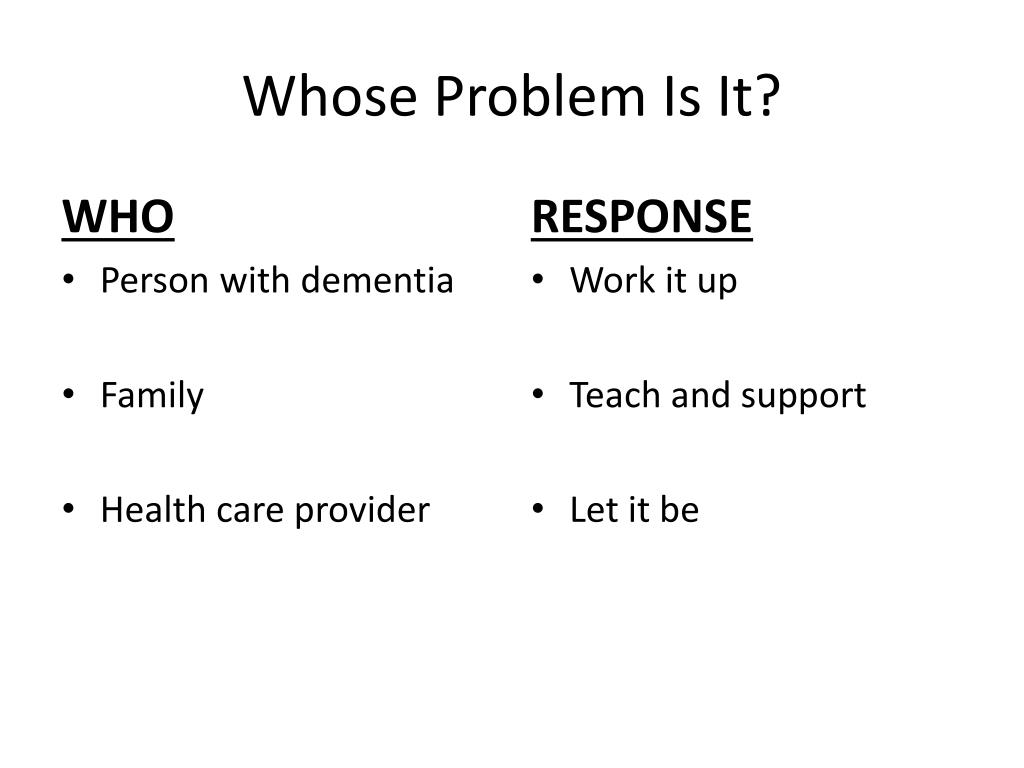 WHO Person with dementia Family Health care provider RESPONSE Work it up Teach and support Let it be Whose Problem Is It?