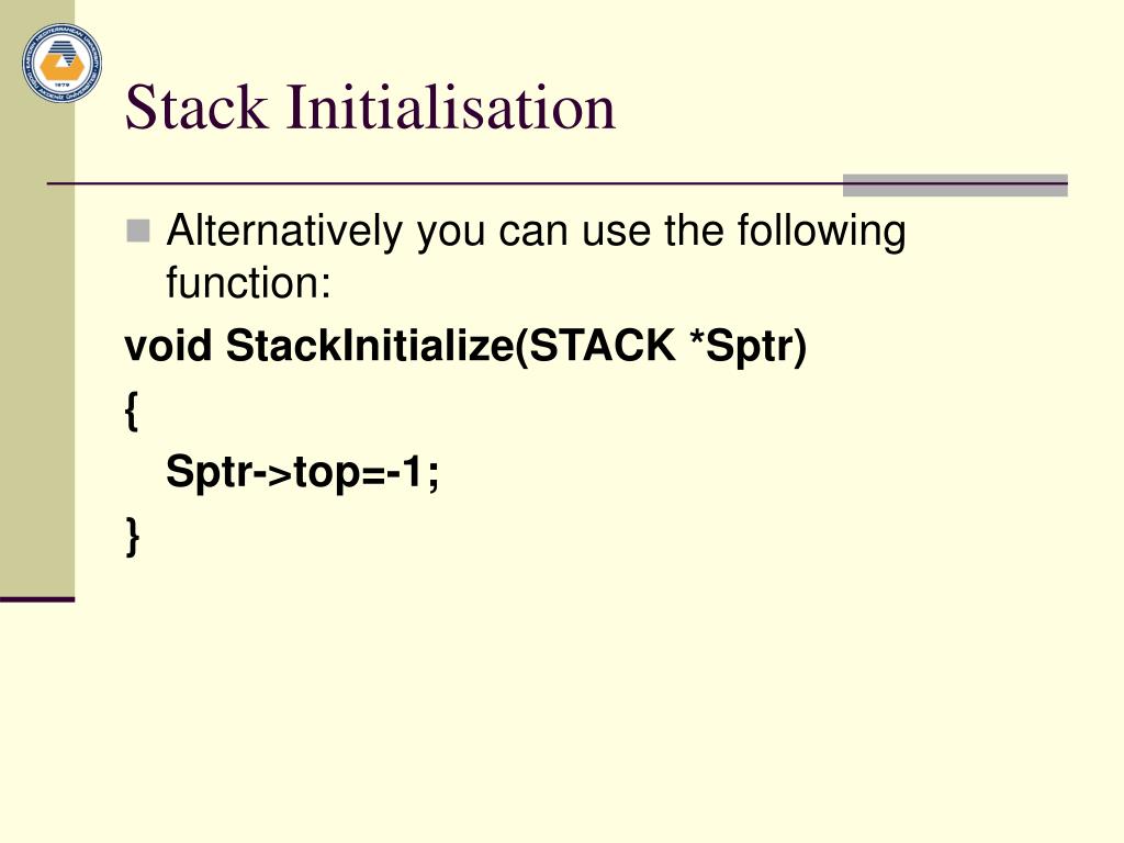Stack Initialisation • Alternatively you can use the following function: void StackInitialize(STACK *Sptr) { Sptr->top=-1; }